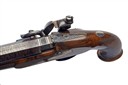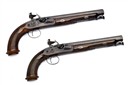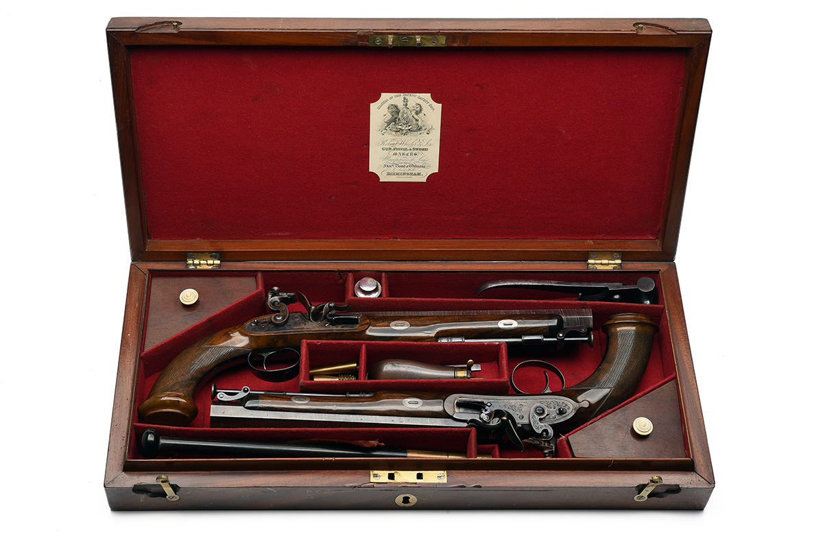 circa 1814, with browned laminated octagonal 10in. barrels, the top flats signed 'ROBERT WHEELER & SON, MAKERS TO HIS MAJESTY', bead fore-sights, colour hardened patent breech-blocks with engraved shell and quadruple platinum lines, borderline and scroll engraved colour hardened top-tangs with shallow notch rear-sights, platinum lined touch-holes, borderline and scroll engraved colour hardened locks signed 'ROBERT WHEELER & SON', roller frizzens with tilted rainproof pans, bolted safes behind the cocks, walnut full-stocks with chequered grips and moulded pommels, blued furniture, twin barrel keys and captive iron ramrods, both pistols being in outstanding condition and appearing little used with just light marks to the French polished stocks, in their maker's walnut case lined and compartmented in red baize (some hidden mothing), trade label inside lid and with a number of period accessories (some added later)