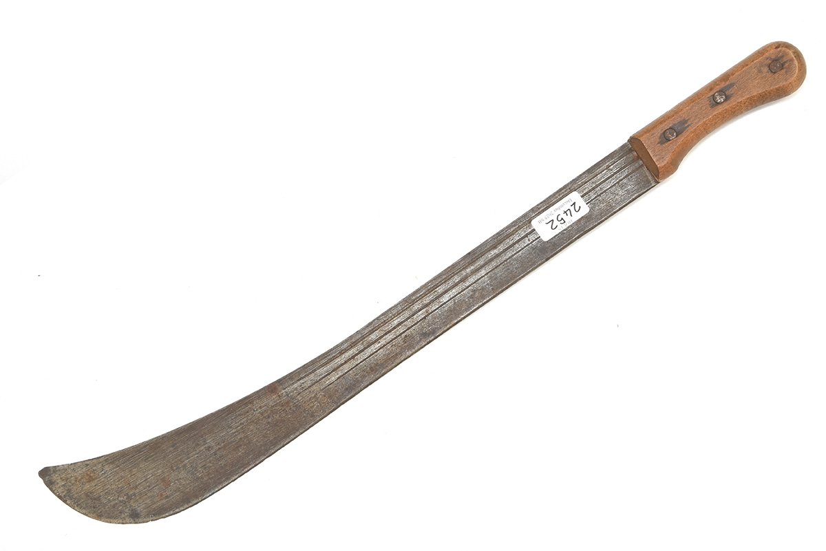 A 'RALPH MARTINDALE' CROCODILE MACHETE, No. 1778, approx. 21 3/4in. carbon steel blade, wood scale handle (2)