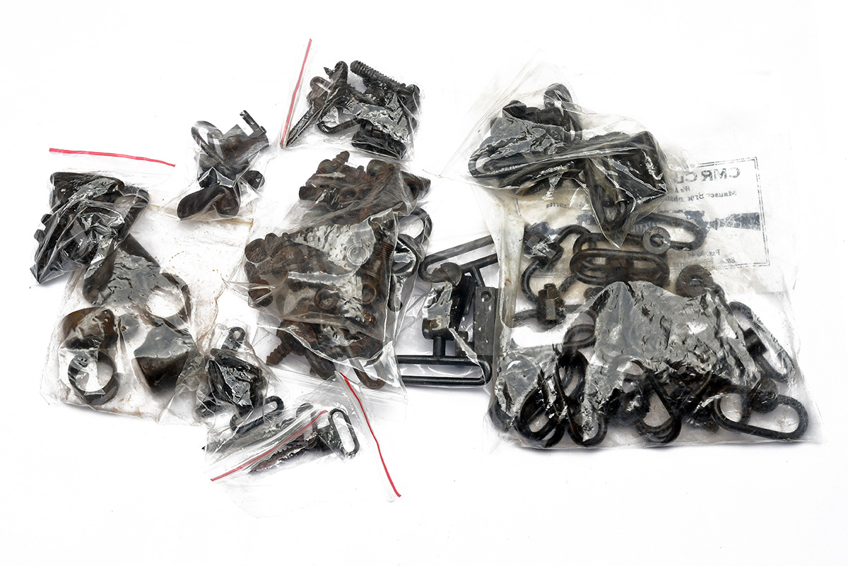 A TUB OF MIXED SLING SWIVELS AND RELATED PARTS, many different sizes, mostly complete fittings but also includes barrel fittings and stock eye-screws, approx 80 pieces