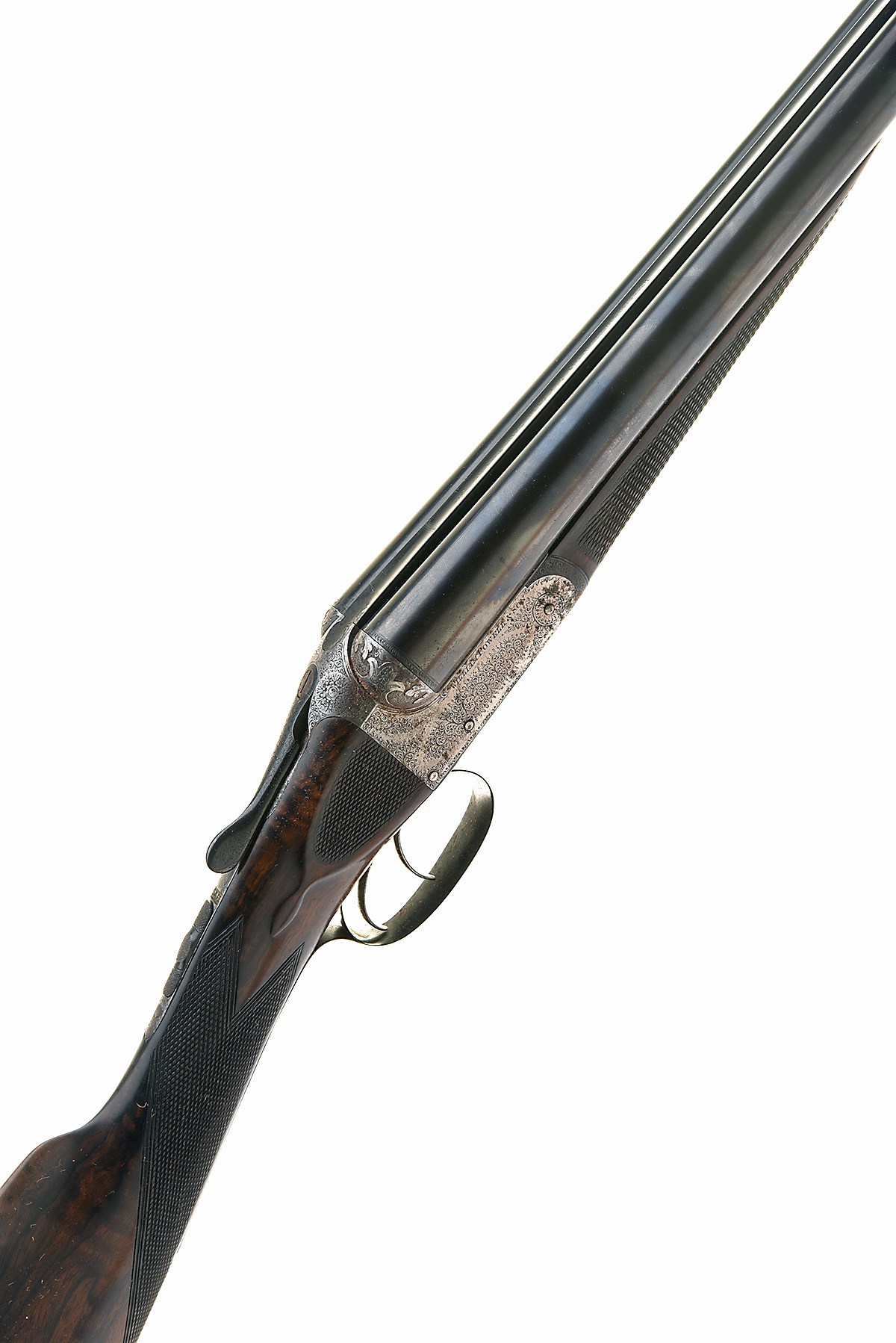 WILLIAM POWELL & SON 12-BORE BOXLOCK EJECTOR, serial no. 9043, for 1891, 28in. nitro reproved blacked damascus barrels (in 1982), the rib engraved 'WILLIAM POWELL & SON. 13. CARRS LANE. BIRMINGHAM.' the breech-end engraved '1' and with acanthus scroll detailing, 2 1/2in. chambers, bored approx. true cyl. in both, right wall at 17, Anson & Deeley 1875 patent treble-grip boxlock action, patent use number 10183, toplever engraved '1', automatic safety with gold-inlaid 'SAFE' detail, Deeley 1886 patent ejectors, patent use number 1727, border and scroll engraving, brushed bright and reblued finish overall, 14 1/4in. figured stock with chequered side panels, including buttplate, stock and triggers slightly swept for a left hander, weight 6lb. 3oz., in a leather leg of mutton guncase
