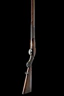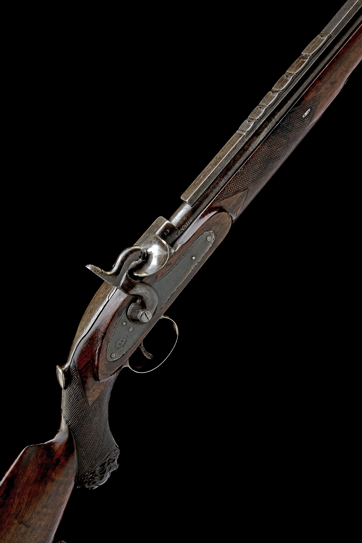 circa 1865, with round 25 1/2in. barrel, broad machine engraved top-rib marked 'WHITWORTH PATENT', block and bead fore-sight, 'Africa' style rear-sight consisting of six flush folding leaves, borderline engraved flip-up 'monkeytail' breech, borderline engraved lock (some pitting) marked at the tail 'J.R. & Co.' within an oval border and 'TRADE MARK', chequered walnut pistol-grip full-stock (well repaired at wrist), the grip pommel moulded and carved as the mask of a lion, iron furniture, the heel-plate with central trap containing the original cleaning implements, chequered trigger blade, single split barrel-band, iron under-barrel clearing rod and swivels for sling