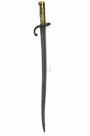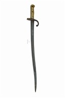 A BRASS HILTED YATAGHAN BAYONET, possibly for a French Chassepot rifle circa 1870, with broad blind-fullered 25 1/4in. blade, brass ribbed grip with iron muzzle-ring cross-guard and turned down quillion, no scabbard