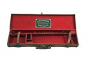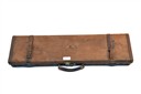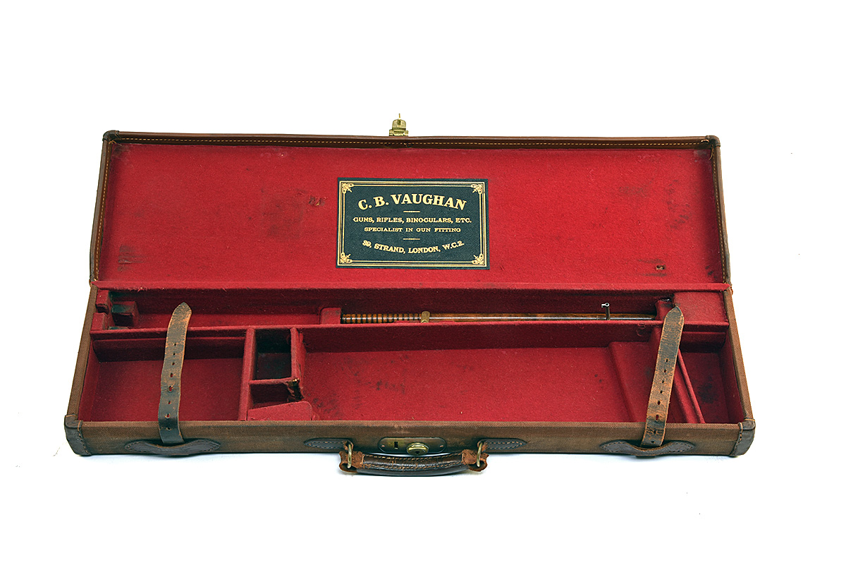 C.B. VAUGHAN CANVAS AND LEATHER SINGLE GUNCASE, fited for 26in. barrels (could adapt to 28in.), the interior lined with red baize, the lid interior with 'C.B. Vaughan. Guns, Rifles, Binoculars, Etc. Specialist in gun fitting. 39, Strand, London, W.C.2.' trade label, brass lock (with key), leather fixing straps, the outside of the lid embossed 'J.A.L.',