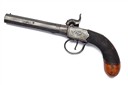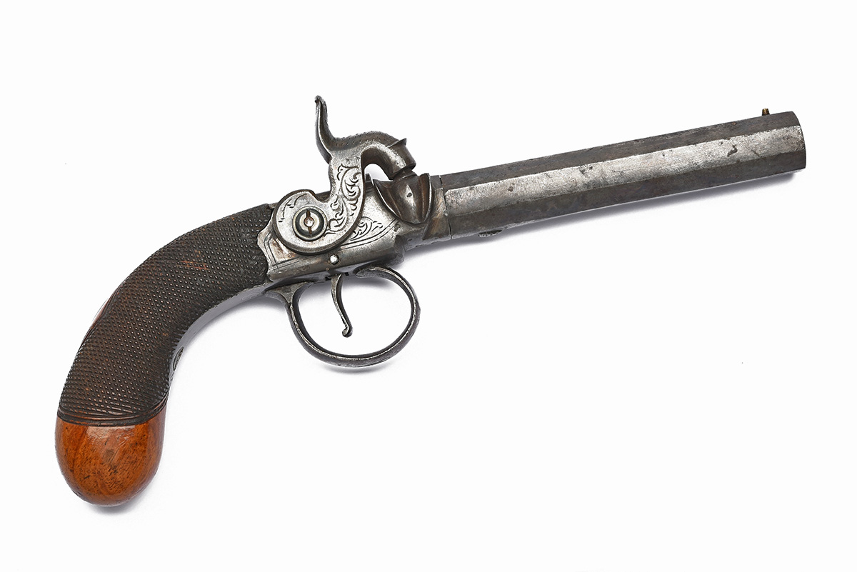 A 50-BORE SINGLE-SHOT SIDE-HAMMER OVERCOAT PISTOL, UNSIGNED, no visible serial number,