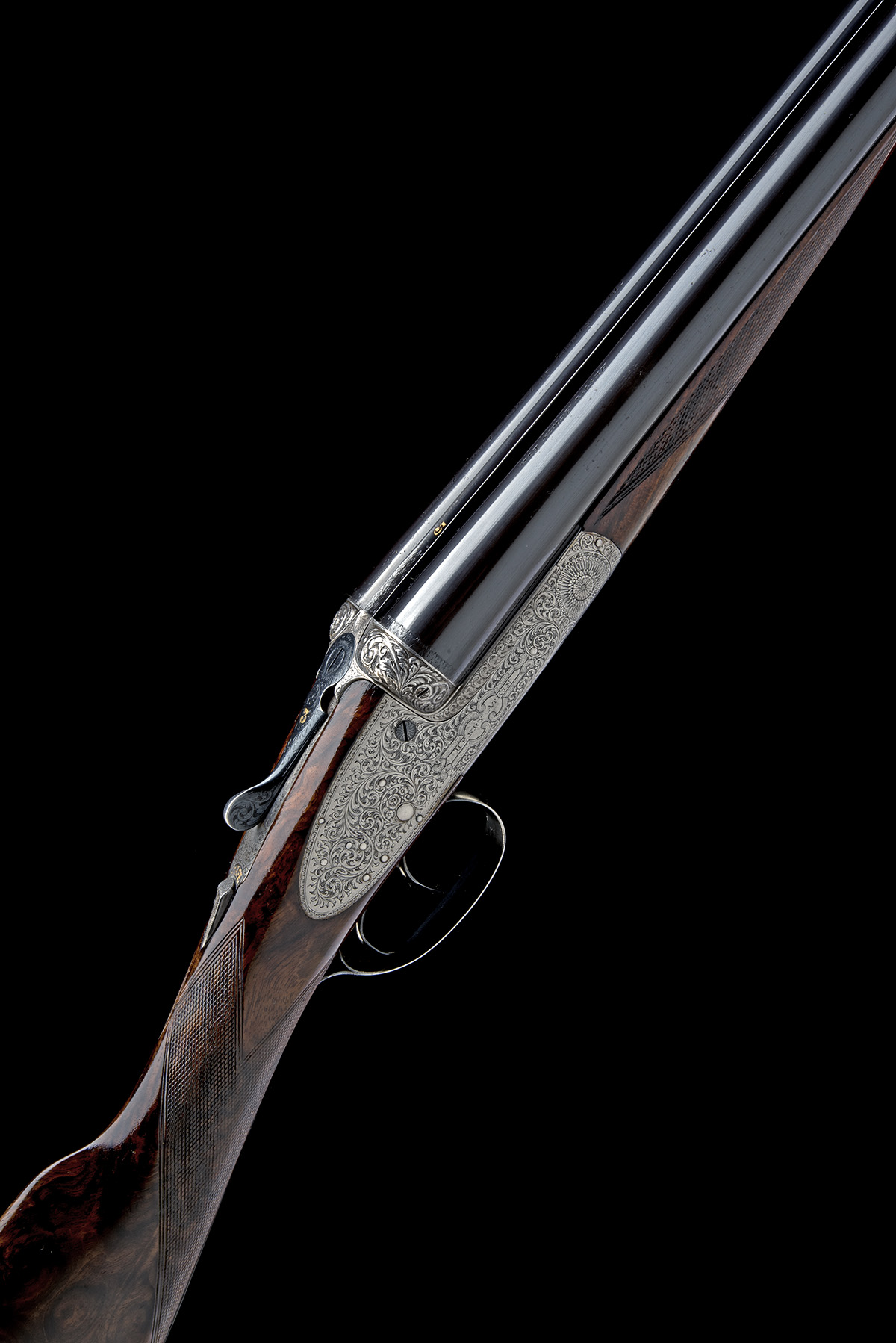 for 1912, 28in. replacement nitro reproved chopperlump barrels (in 1987, reproved after chambers extended in 1989), rib gold-inlaid '3', tubes engraved 'HENRY ATKIN LTD. 7, BURY STREET ST. JAMES'S LONDON.', 2 3/4in. chambers, bored approx. true cyl. and imp. cyl choke, rounded bar action with removable striker discs, the fences deeply carved with scrolled acanthus, toplever gold-inlaid '3', automatic safety with gold-inlaid 'SAFE' detail, spring opening action based on the Beesley / Purdey 1880 patent with 1909 model improved ejector, best bold scrolling acanthus engraving with floral detailing, the makers name in an elaborate cartouche to the lockplates, the underside with 'HENRY ATKIN FROM PURDEY'S' in a further cartouche, bright and blued finish, 14 3/8in. highly-figured replacement stock, cast on for the left shoulder, the fore-end finial gold-inlaid '3', weight 6lb. 10oz., with a nylon gunslip