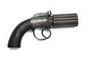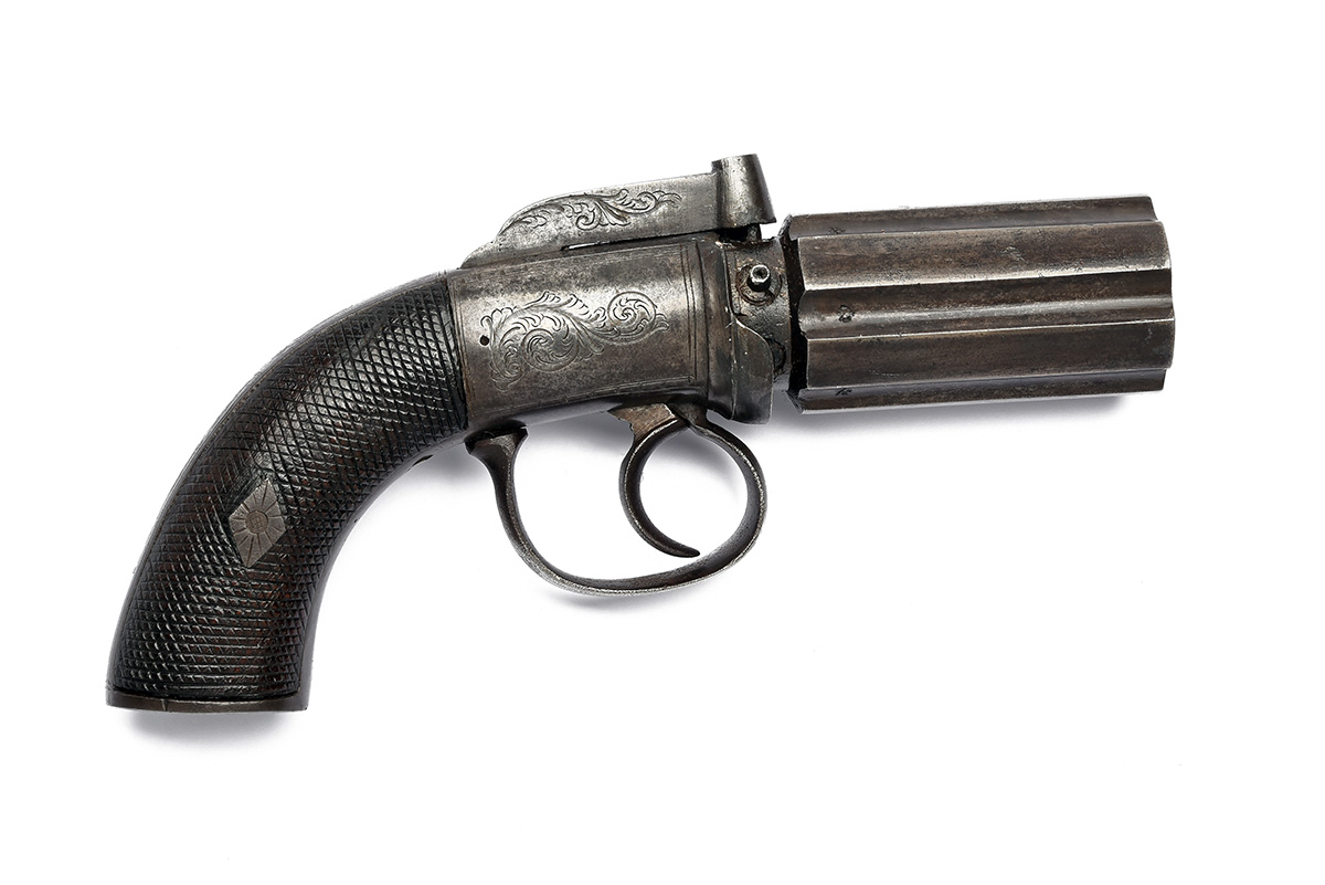 A 120-BORE 6-SHOT DOUBLE-ACTION PERCUSSION PEPPERBOX REVOLVER, UNSIGNED, no visible serial number,