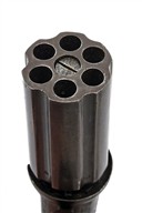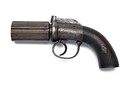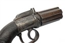 A 120-BORE 6-SHOT DOUBLE-ACTION PERCUSSION PEPPERBOX REVOLVER, UNSIGNED, no visible serial number, circa 1850, with 3 in. fluted barrel cluster with Birmingham proof-marks, scroll-engraved frame, bar-hammer, back-strap, trigger-guard and butt-cap, chequered wooden grips, some pitting to the trigger-guard, wear and scratches to the grips