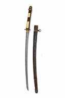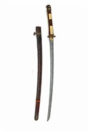 A JAPANESE KATANA WITH SIGNED BLADE IN SHIN-GUNTO MOUNTS, first half of the 20th century, with 26in. slightly curved blade (finish dulled and stained), silvered brass habaki, ray-skin partially cotton-bound hilt with moulded and carved brass tsuba, wood scabbard leather weather cover and single suspension ring