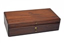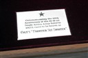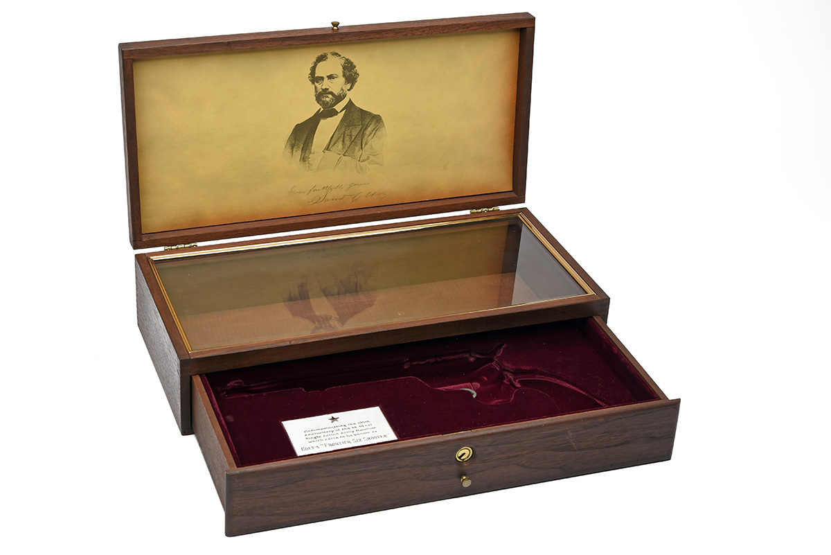 A 'SAM COLT 1873 PEACEMAKER CENTENNIAL' PRESENTATION CASE, with cal .45 colt '1873 PEACEMAKER CENTENNIAL 1873' colt on exterior lid, interior lid with a picture of sam colt, glass presentation case with a plague reading 'commemorating the 100th anniversary of the 44-40 cal. single action army revolver which came to be known as COLTS FRONTIER SIX SHOOTER', purple baize lining, pull out draw, brass lock with key