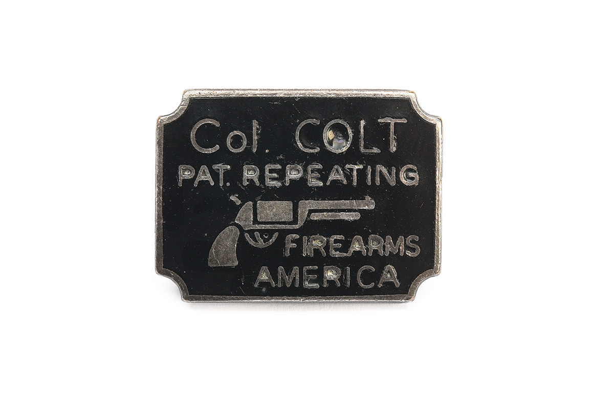of rectangular form with indented corners, measuring approximately 1in. x 3/4in., the front with the legend 'COL COLT PAT REPEATING FIREARMS AMERICA' together with a depiction of an open frame revolver, the surface flooded with black enamel, the reverse with safety pin clip and stating in raised letters 'GIVEN TO YOU BY COL SAM COLT CRYSTAL PALACE INTERNATIONAL EX MAY 1851'. contained in a later embroidered pouch