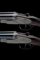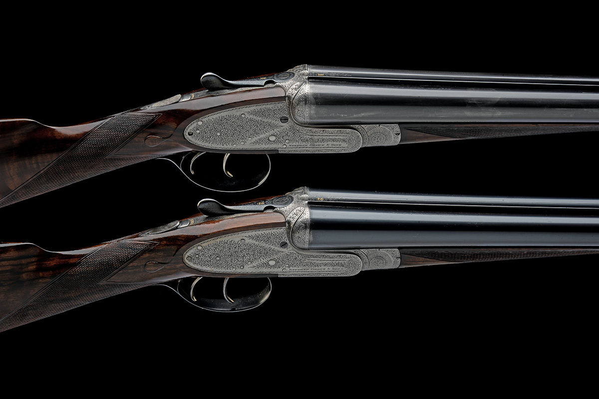 circa 1930, 28in. nitro barrels, No.1 replacements, No.2 reproved in 1994, the ribs gold-inlaid '1' and '2' at the breech ends (No.1 loose, No.2 slight distortion to under rib), the tubes engraved 'STEPHEN GRANT & SONS. 7. BURY STREET. ST. JAMES'S. LONDON', 2 1/2in. chambers, bored approx. imp. cyl. and 1/2 choke, No.2 right wall at 16, slender W. Baker patent assisted-opening actions, patent no.16778 of 22nd March 1913, with Baker patent ejectors, fluted stylised acanthus fences, removable striker discs, toplevers gold-inlaid '1' and '2', automatic safeties with gold-inlaid 'SAFE' details, articulated front triggers, best fine border and acanthus scroll engraving, brushed finish, 15 1/2in. highly-figured replacement stocks, fore-end woods with insert repairs to edges, weight 6lb. 8oz. (No.1) and 5lb. 15oz. (No.2) in a brass-cornered oak and leather case