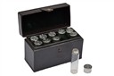 eight shot glasses numbered 1-8 in the form of a shotgun cartridge, housed in a velvet-lined leather case