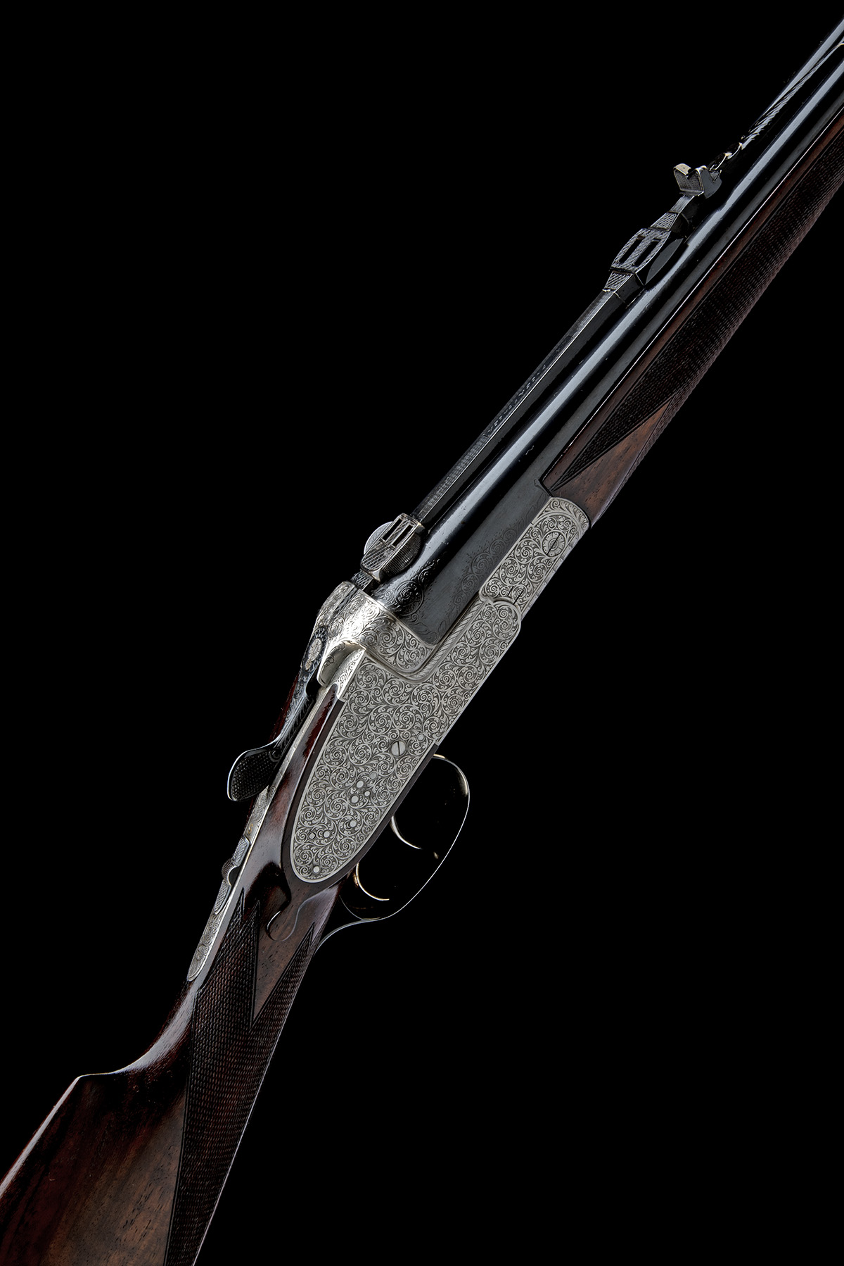 for 1972, 25 5/8in. nitro reproved Bohler Antinit-steel nitro chopperlump barrels (in 2003), matt sight rib with open sights and banner engraved 'KAL. 7X65R - 7X65R' with quickly-detachable telescopic sight mount bases, the rib engraved ' - JOSEF WINKLER. FERLACH - AUSTRIA -', ramp-mounted bead fore-sight, treble-grip action with short side-bolsters, removable striker discs, manual safety, hand-detachable lockplates with concealed flush release lever, cocking-indicators, articulated front trigger, fully engraved with bold Germanic scroll engraving, silver and blued finish, 14in. stock including 7/8in. recoil pad, 10 1/2in. fore-end with Deeley & Edge patent release and engine turned finish to the iron, weight 8lb. 14oz.