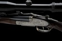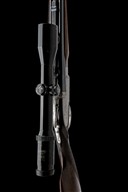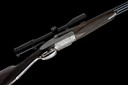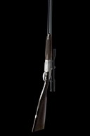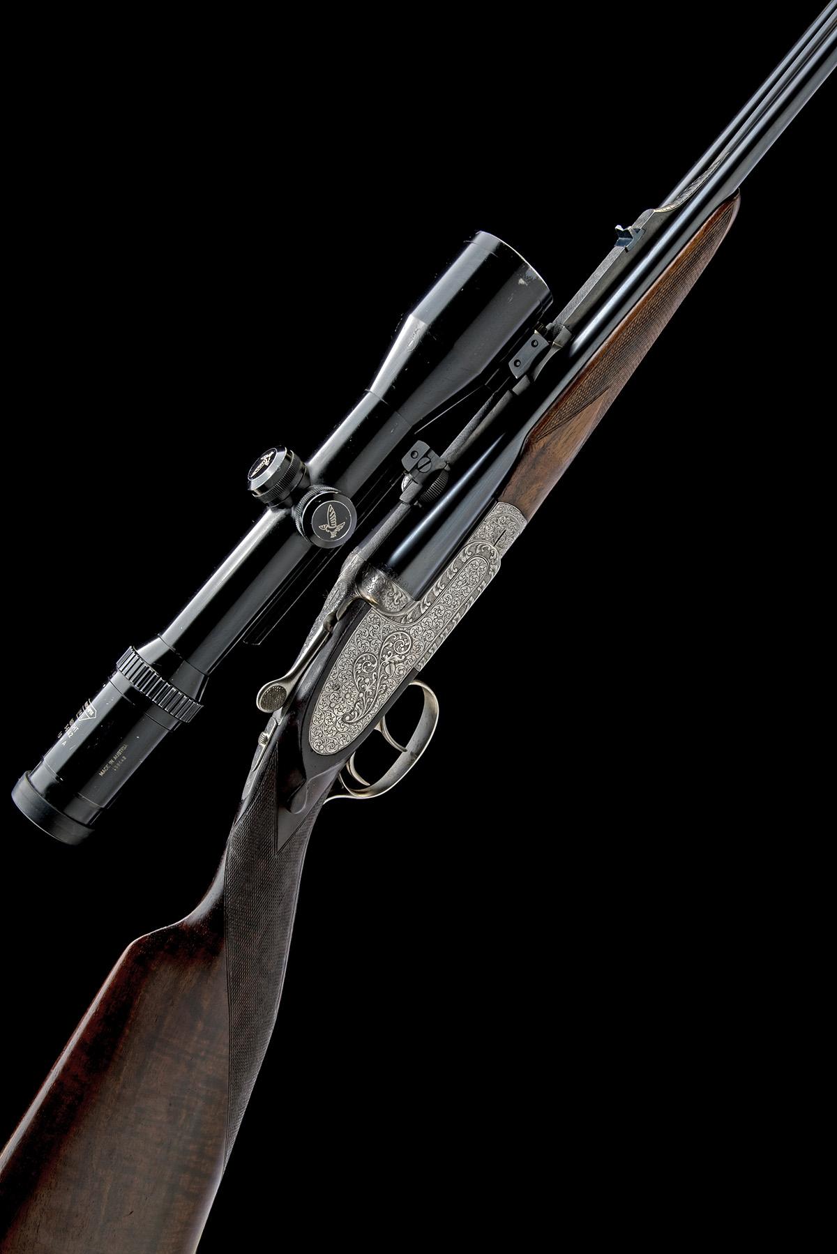 for 1963, 24 3/8in. (62cm) unsigned nitro barrels, ramp-mounted bead fore-sight, matt sight rib with open sights and mounted with a Swarovski-Optik Habicht 1,5-6x42 Nova telescopic sight, serial no. 159442, in quickly-detachable mounts, unsigned treble-grip action with hidden third bite, removable striker discs, manual safety, cocking-indicators, bold acanthus scroll engraving with bold foliate detailing, bright finish, 14 5/8in. figured swan necked stock, slight grain separation to right underhorn, beavertail fore-end, weight 7lb. 7oz. (unscoped) and 8lb. 11oz. (with scope)