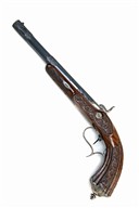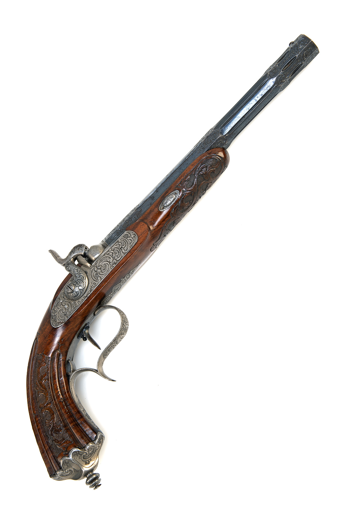 circa 1845, the blued 9 3/8in. octagonal barrel with dovetailed blade fore sight, narrow blind flutes and engraved flats to the muzzle, centre and breech, scroll engraved breech with number '1' to the bolster, the tang with standing notch rear-sight, scroll engraved bar-action lock, en-suite hammer (not holding on cock), walnut half stock with fluted grip and carved central scrolled panels, moulded and engraved spire iron butt cap, adjustable set trigger and iron trigger-guard with finger spur, no provision for ramrod, much original finish
