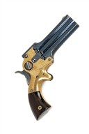 circa 1866, with hinged and moulded vertically stacked blued 3in. three-barrel group, small applied nickel-bladed fore-sight, rotating dove-tailed locking catch with central sighting groove mounted to top of the plain brass receiver, the side with the details 'WM. W. MARSTON PATENTED MAY 26 1857 NEW YORK CITY IMPROVED 1864' on the left hand face and rotating barrel indicator on the right (traces of colour, light bruising around extractor), external colour hardened spurred hammer, spur trigger and brass grip-straps fitted with smooth walnut grips (left with hairline cracks), much finish remaining throughout