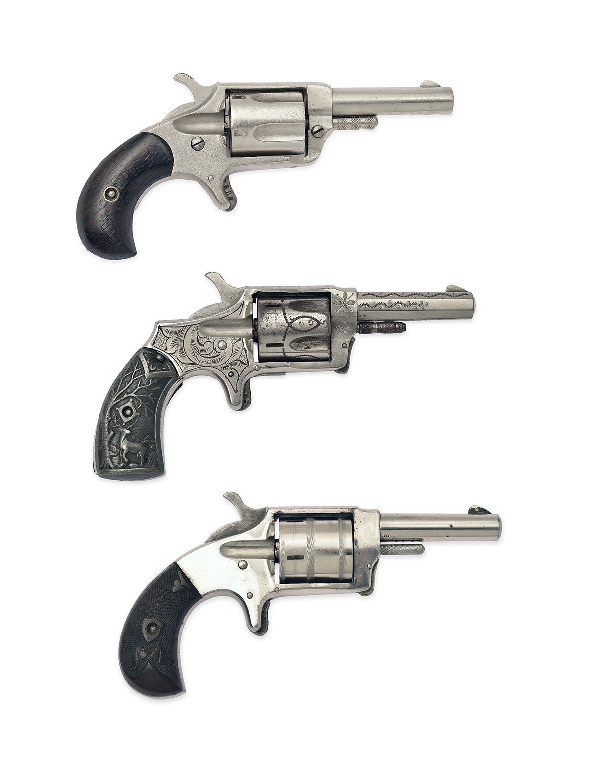 THREE .32 (RIMFIRE) AMERICAN-MADE SPUR-TRIGGER SINGLE-ACTION POCKET REVOLVERS, serial numbers 3859, 5469 & 1820,