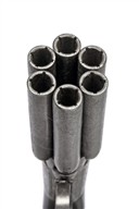 Belgian circa 1840, with six etched damascus 2 5/8in. turn-off barrels (all currently frozen) numbered respectively '1' through '6', border and scroll engraved rounded boxlock action, the ring trigger drawing back an under-hammer to strike the rearward facing nipples, integral grip-straps, the rear scroll engraved, the front marked 'MARIETTE BREVETE' and smooth ebony bag-shaped grips