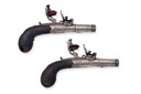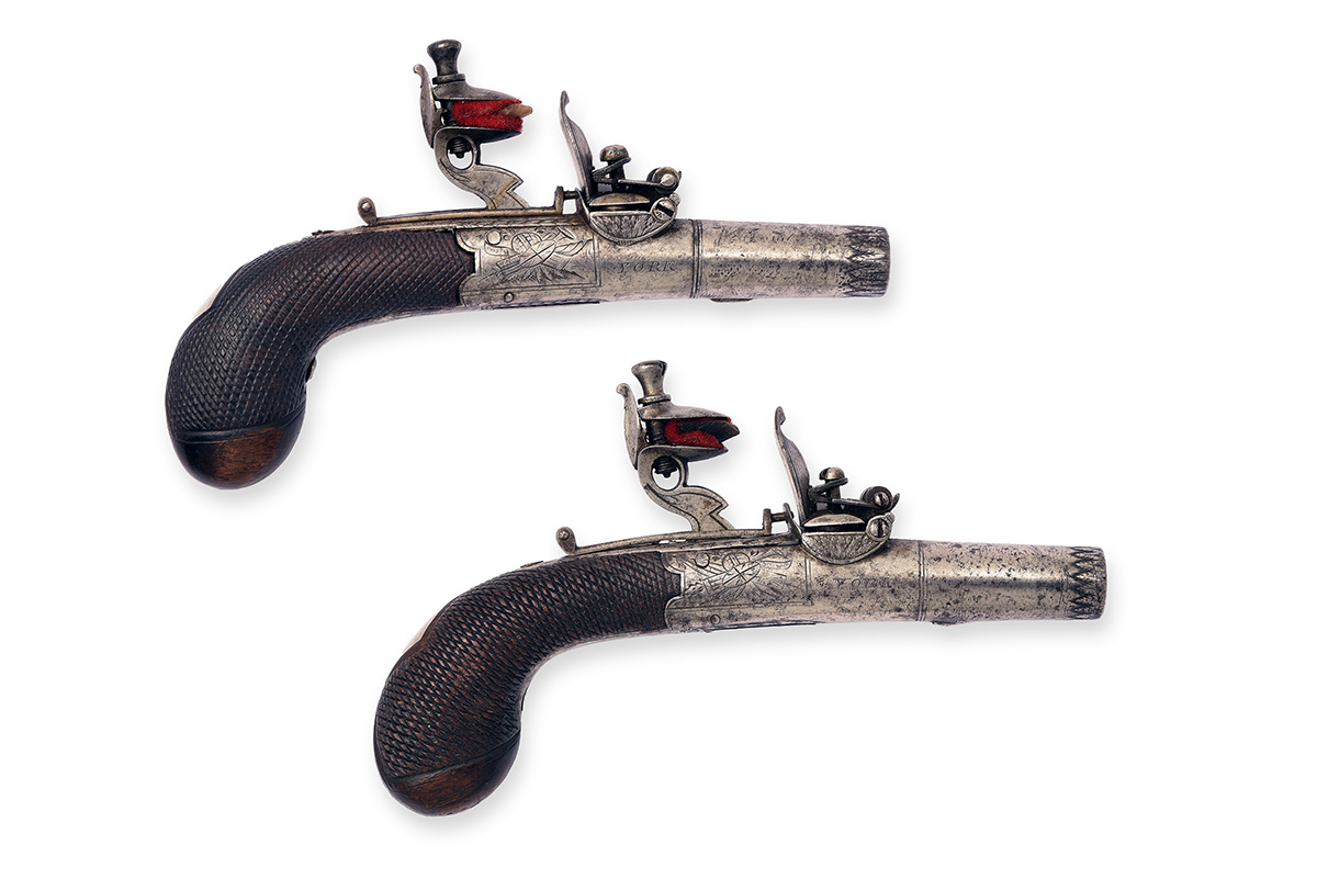 circa 1810, with round turn-off slightly tapering 1 1/2in. barrels (frozen), broad engraved bands at the muzzles, further engraved bands at the joints, private Tower proofs, slender rounded iron bodies with trophy engraved panels to both sides and signed 'WOOD' on the left and 'YORK' on the right below the sculpted and engraved rainproof pans, roller frizzens, ring-neck central cocks, sliding safes also locking the pans, chequered walnut bag-shaped grips with white metal diamond-shaped escutcheons to wrists and concealed automatic triggers, 5 1/2in. overall lengths
