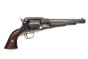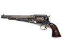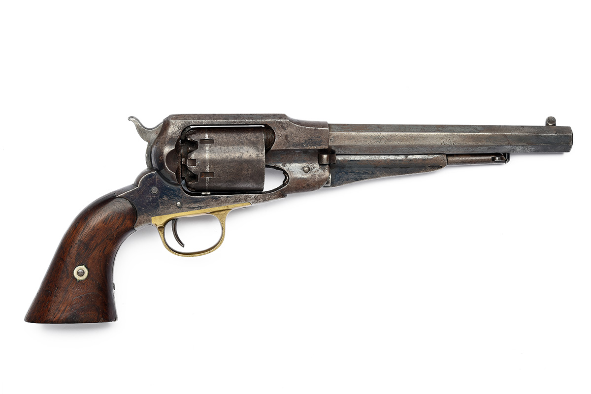 American Civil War period, with blued octagonal 8in. barrel signed 'PATENTED SEPT 14 1858' over 'E. REMINGTON & SONS ILION NEWYORK, U.S.A.', not marked 'New Model', blued solid frame with exposed barrel throat threads, plain six-shot cylinder, single action mechanism, brass trigger-guard and smooth flared walnut grips with martial cartouche to left grip (small loss to toe), inspector's stamps 'A', 'P' and 'J', strong traces of finish