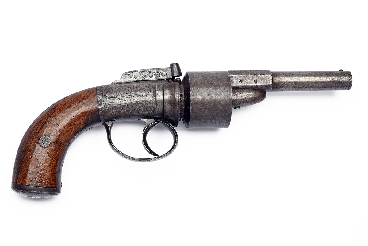 A 46-BORE PERCUSSION TRANSITIONAL 'IMPROVED REVOLVING CHAMBERS' REVOLVER SIGNED B. WOODWARD, LONDON, no visible serial number,