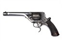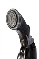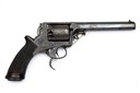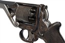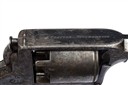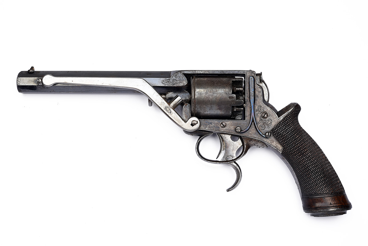 second model circa 1855, with blued octagonal 6 1/8in. barrel, dove-tailed fore-sight, engraved band at muzzle, standing notch rear-sight to the rear of the solid border-engraved top-strap, borderline and scroll engraved frame, plain five-shot cylinder with borderline engraving and a rope-twist band to leading edge, trigger-cocking action with spur-less hammer, inverted 'Y' shaped safe spring, detachable Tranter's patent rammer (cleaned of finish), exposed cocking trigger below the guard and chequered walnut one-piece semi saw-handled grip with flared pommel and moulded iron cap, strong traces of original finish remaining