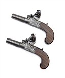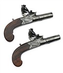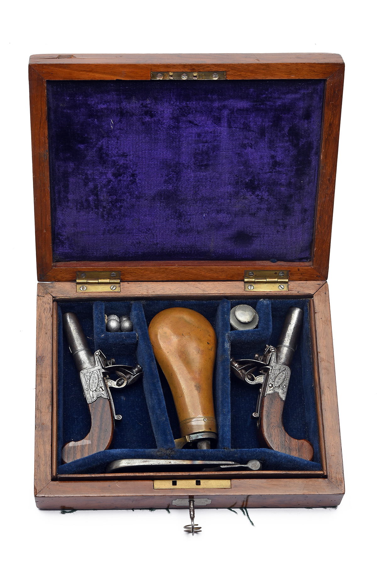 A CASED PAIR OF 180-BORE FLINTLOCK MUFF-PISTOLS SIGNED A. & E. WESTON, LEWES, no visible serial numbers,