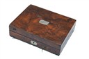 circa 1810, with slightly tapered iron 1 1/4in. turn-off round barrels, engraved bands at the joints, private proofs, borderline and trophy engraved squared boxlock actions with central ring-necked cocks and concealed automatic triggers, the left sides signed in central oval panels 'A & E WESTON', the right sides 'LEWES', top-tang safes also locking the frizzens, slab-sided walnut grips, in a period burr walnut casing adapted for these pistols, relined and compartmented in blue velvet and including a flask (mainspring replaced), oil bottle and mould, white metal escutcheons to the lid and lock, with key, each pistol 4 3/4in. overall