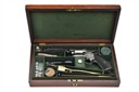 third model circa 1865, with blued octagonal 4 3/4in. barrel (much original finish remaining), engraved band at muzzle, the top-flat signed 'WEBLEY & SON BIRMINGHAM', borderline and scroll engraved silver-plated open frame with wingnut barrel mount, five-shot cylinder rotating to the right and with scroll engraved detail, single action mechanism with re-coloured and engraved hammer sides, permanently attached Kerr-style rammer mounted to left side of barrel, the full-length back-strap engraved 'BY HER MAJESTY'S ROYAL LETTERS PATENT' surmounted by the serial number, chequered walnut grips and engraved butt-cap with central eyelet for lanyard, small oval trigger guard, well refinished throughout except where noted, Birmingham proof marks, in its original fitted mahogany case lined in green baize with accessories including brass 60-bore bullet mould marked 'WD', brass-mounted copper pistol-flask, tins for caps and lubricating compound, turn-screw and nipple key, oil bottle and mahogany loading rod, the lid with exterior with shaped brass escutcheon, complete with key