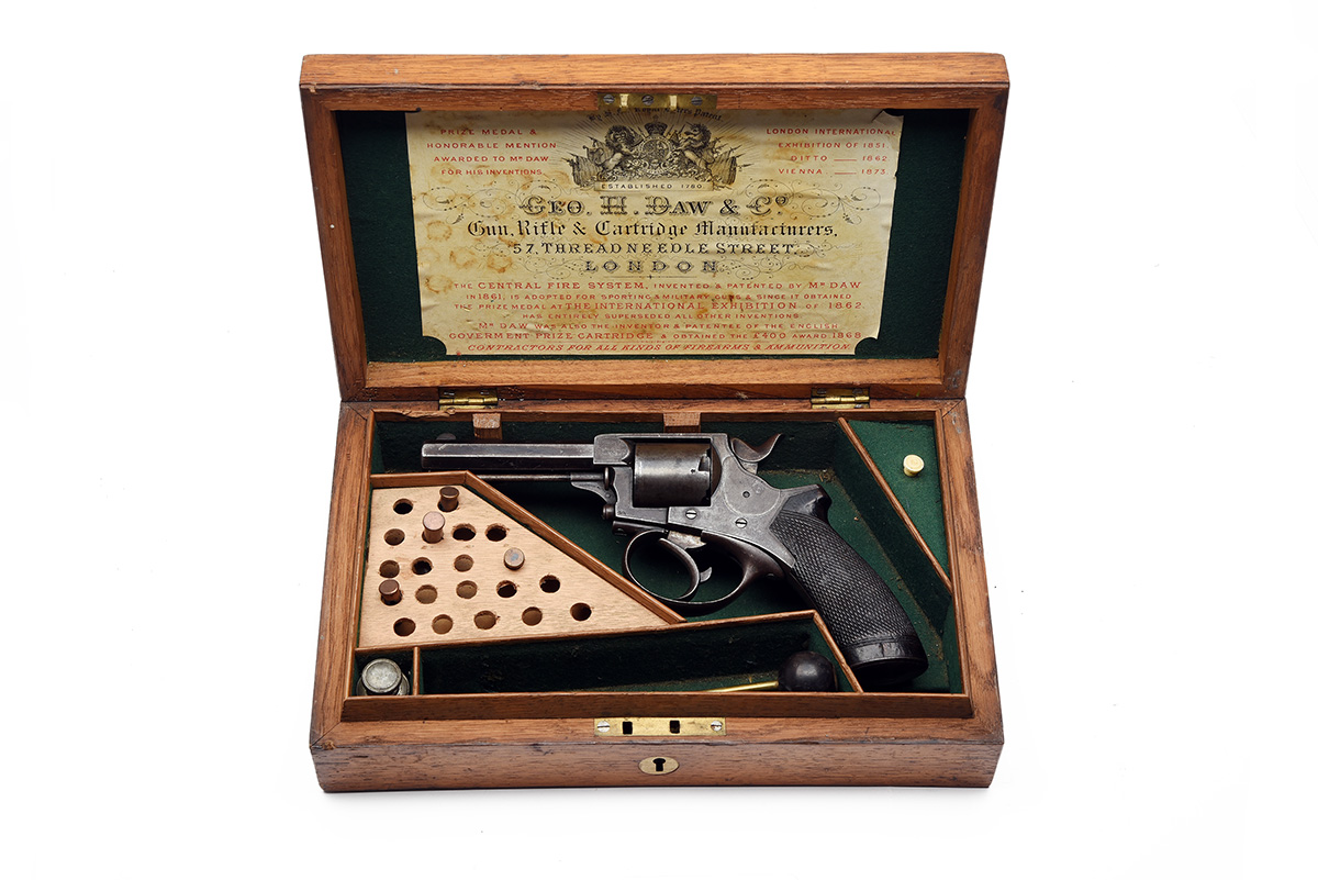 being an 1868 Long Ejector model circa 1870, with octagonal 3 3/4in. barrel, the top-flat signed 'J.H. CRANE, 5 ROYAL EXCHANGE, LONDON', the right side upper flat engraved 'M D'ARCY WYVILL ESQ', crescent fore-sight, sighting groove to the solid top-strap, borderline engraved frame with plain five-shot cylinder, side loading gate, double action mechanism with spurred hammer, chequered walnut semi saw-handled grip with shallow domed iron cap and guarded trigger, the underside of barrel with distinctive crane-mounted 'long' ejector, traces only of finish and in a period oak casing for another revolver, lined and compartmented in green baize, with a Geo. Daw & Co. parchment label and a number of added later accessories