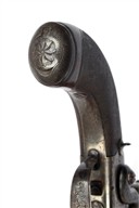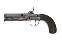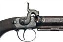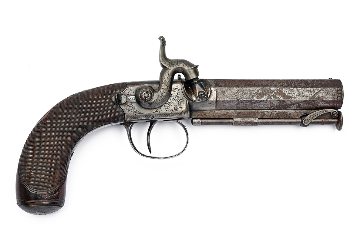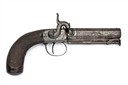 circa 1840, with 3 1/4in. octagonal barrel signed on the top flat 'WILKINSON & SON LONDON', engraved band to muzzle, German silver bead fore-sight, London proofs, scroll and border engraved rounded boxlock action with notch rear sight, engraved side-hammer with sliding safety, finely chequered walnut bag-shaped grip with white-metal oval escutcheon engraved 'R J', central trap to the domed pommel-cap, guarded trigger and captive under-barrel iron ramrod, blued spring steel belt hook to the left side