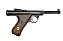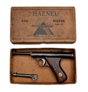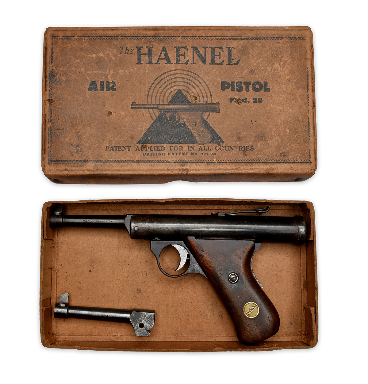 circa 1934, with two 4in. interchangeable break-open to load barrels, dove-tailed fore-sights, plain air-chamber lifting to cock via release catch on the trigger guard and with patent markings including 'HAENEL MOD 28, BRIT PAT. No. 277265 D.R.P.', buckhorn rear-sight, smooth walnut grips with brass Haenel medallions, the whole an older faded refinish, in its maker's English market brown card carton, the lid with an illustration of the pistol against a target background surrounded by the make and model details, all above 'PATENT APPLIED FOR IN ALL COUNTRIES' and 'BRITISH PATENT 277265', instructions inside lid (edges of lid worn and cracked)