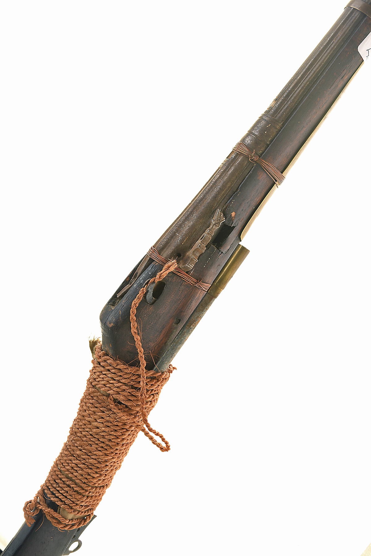 A COMPOSED PAIR OF INDO-PERSIAN MATCHLOCK MUSKETS,UNSIGNED, no visible serial number, both North Indian manufacture with Persian barrels, circa late 18th century, the first 30-bore with 44 1/2in. swamped sighted round barrel with reeding at the muzzle and breech ends, makers cartouche stamps (illegible), serpentine (broken) and pan (cover missing), flat-sided sind style full-stock with horn extension to heel, hatchet style trigger, seven white-metal barrel bands, brass re-enforcement plate to the underside of fore-stock, wooden ramrod (frozen), the second with 43in. swamped sighted round barrel with reeding at the muzzle and breech, serpentine and pan (cover missing), flat-sided sind style three quarter stock, hatchet style trigger, four brass barrel bands with copper wire repairs, brass plate re-enforced stock, no provision for ramrod (2)