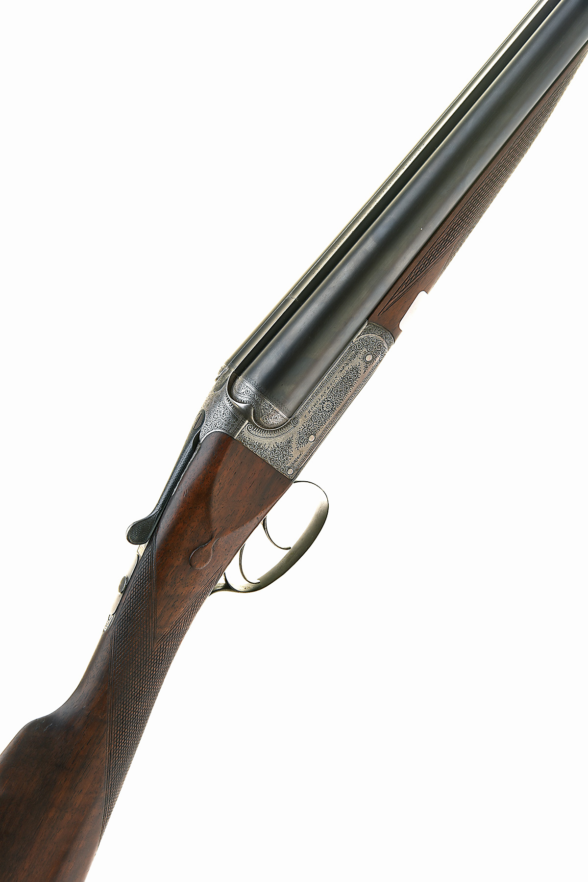 THOMAS HORSLEY & SON 12-BORE BOXLOCK NON-EJECTOR, serial no. 3033, circa 1877, 30in. nitro reproved barrels, the rib engraved 'THOMAS HORSLEY & SON. MAKERS. YORK', 2 3/4in. chambers, bored approx. imp. cyl. and full choke, some pits and dents, Anson & Deeley patent treble grip action, patent no. 756 of 1875, use number 4587, carved fences, slender toplever, automatic safety with gold-inlaid 'SAFE' detail, fine acanthus scroll engraving with ornate bordering, 15in. stock with engraved steel heel and toe plates, fore-end with grip-catch release lever, weight 7lb. 2oz.