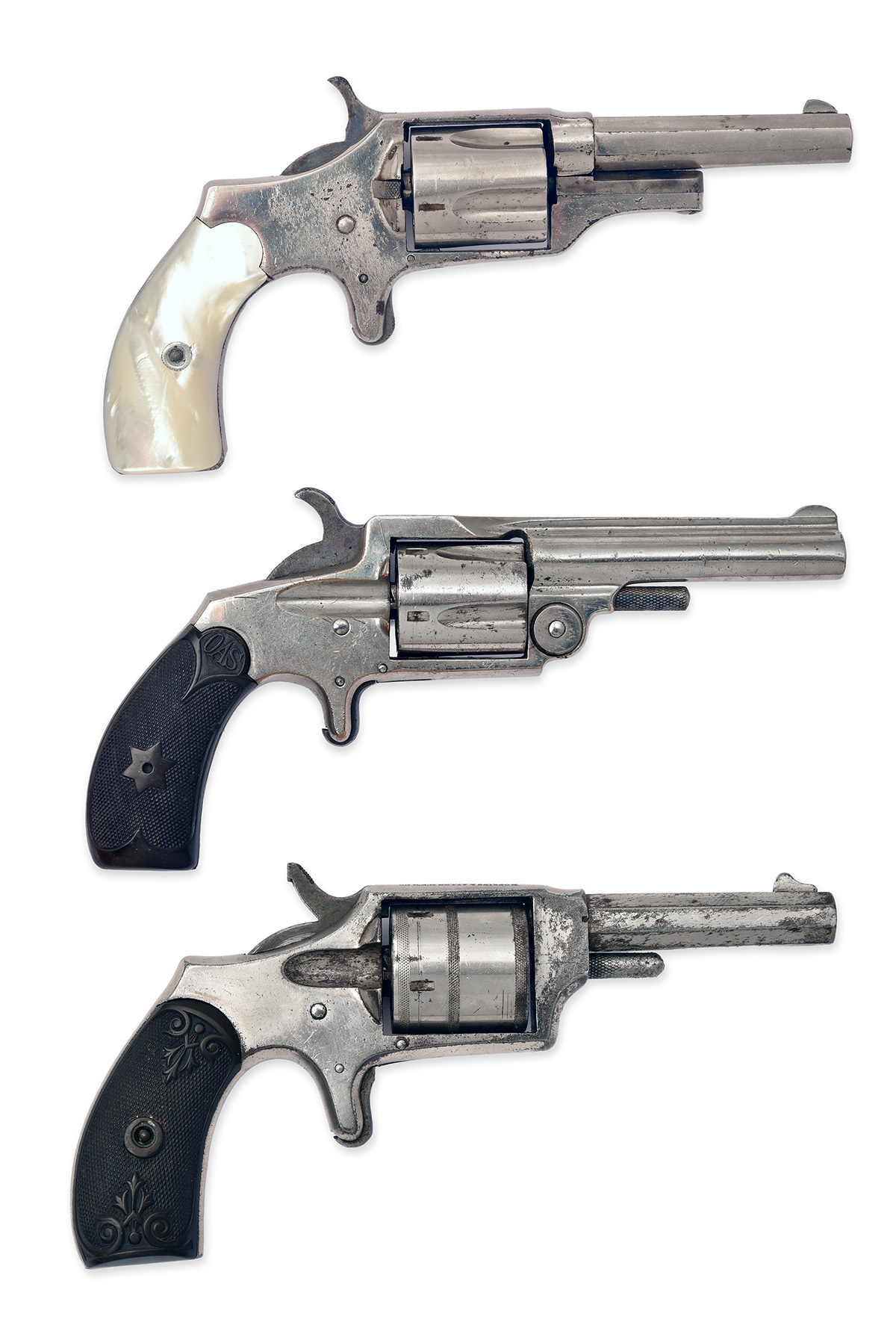 THREE .32 (RIMFIRE) LATE 19th CENTURY NICKEL-PLATED AMERICAN SPUR-TRIGGER FIVE-SHOT POCKET REVOLVERS, serial numbers 2943, 3930 & 3753,