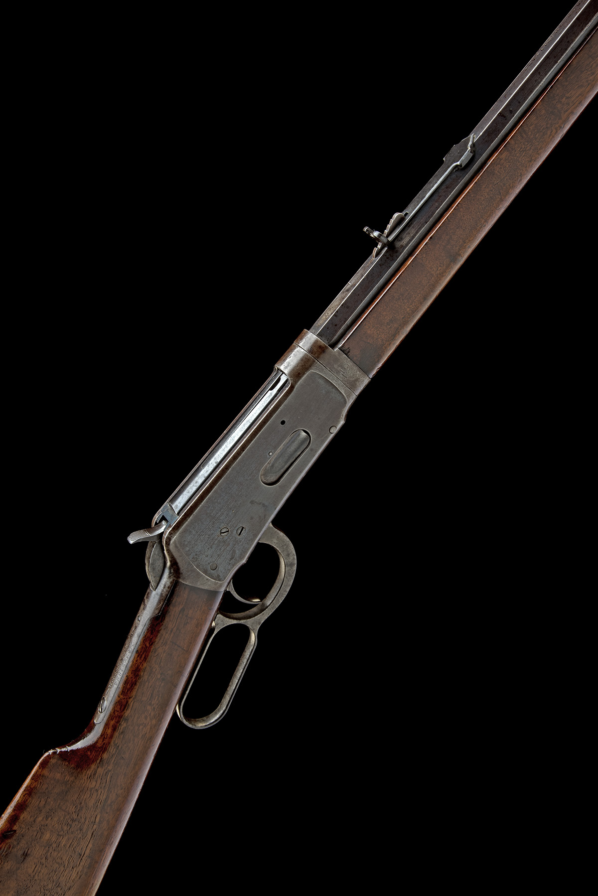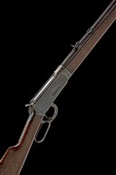 for 1895, with blued octagonal 26in. take-down barrel signed 'MANUFACTURED BY THE WINCHESTER REPEATING ARMS CO. NEW HAVEN CONN. U.S.A.' on two lines, dove-tailed nickel-beaded fore-sight, buckhorn rear-sight with adjustable blade, slab-sided receiver with loading gate, the top tang marked 'MODEL 1894 WINCHESTER, PAT. AUG. 21 1894', walnut straight-hand butt-stock with crescent heel-plate, plain walnut fore-end with iron nose-cap and full-length under-barrel magazine with take-down lever at tip, fair amount of faded original finish to receiver, barrel and traces of colour to finger-lever and heel-plate