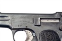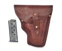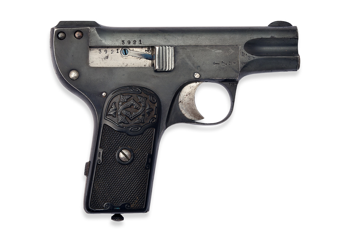 being the 'perfected model of 1905', with fixed under-slung concealed barrel, blued fixed slide with recoil spring above barrel, the left side of action marked 'AUTOMATIC PISTOL CLEMENT'S PATENT' and 'CHARLES PH. CLEMENT, LIEGE', central cocking piece with internal brushed bright bolt, side safe, rear cocking indicator, chequered hard rubber grips embossed with Clement's trademark (left grip cracked and repaired), magazine release in back-strap, the magazine with knurled pull-piece, much finish throughout and complete with a later leather full-flap belt-holster made for this pistol and a spare magazine adapted from another
