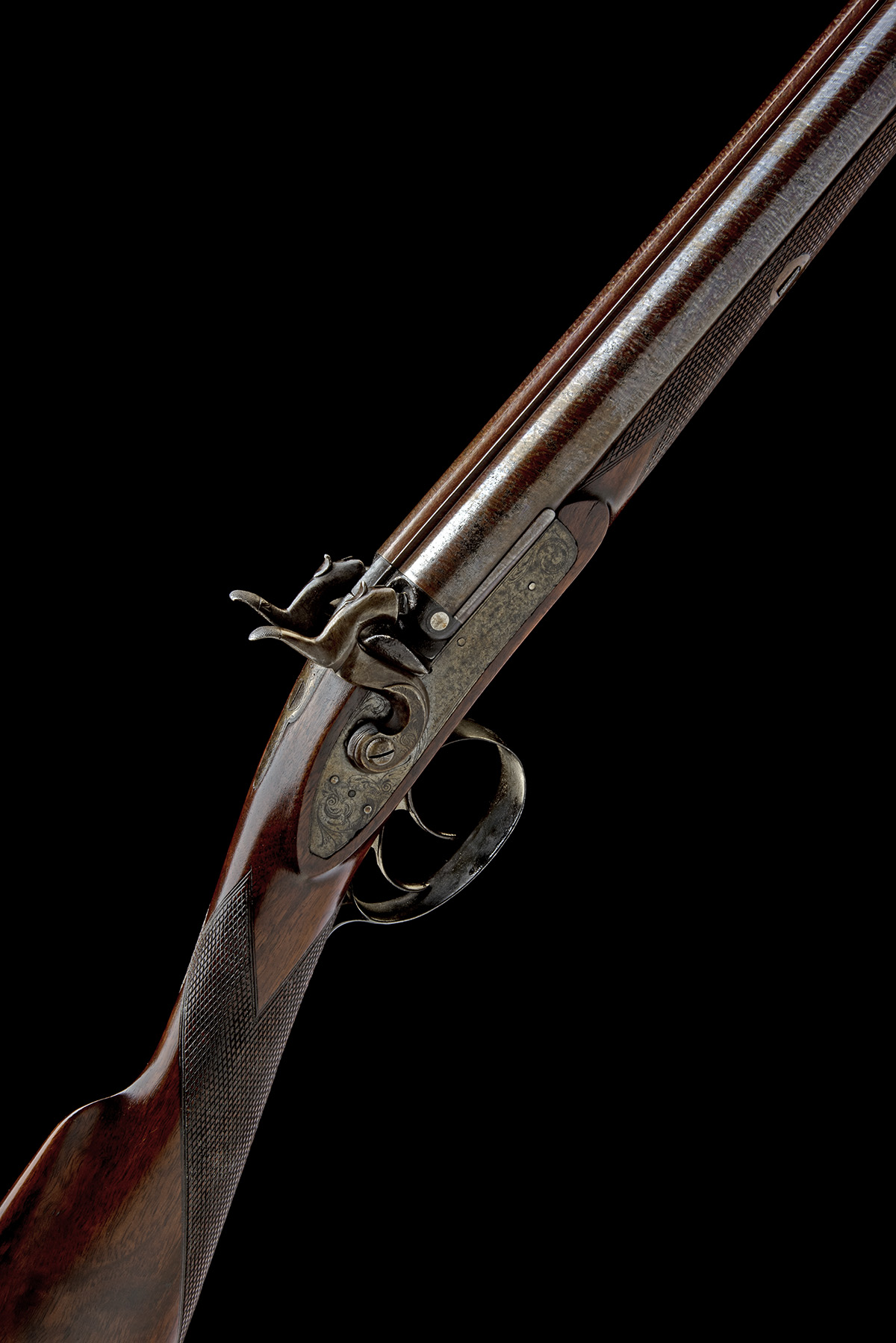 A 16-BORE PERCUSSION DOUBLE-BARRELLED SPORTING GUN SIGNED JOSEPH MANTON, no visible serial number,