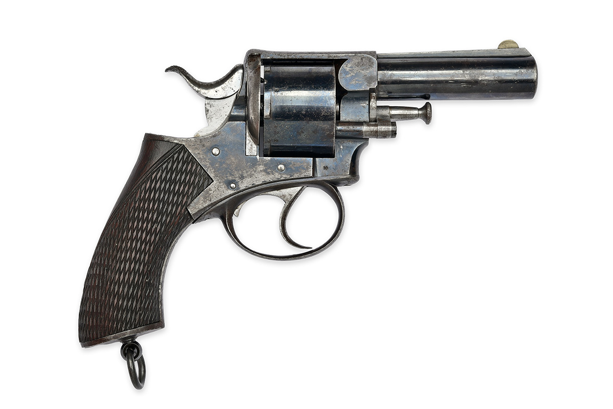 circa 1880, with blued 3 1/2in. barrel, raised ramp sighting rib with nickel crescent fore-sight blade, swing-out cylinder-arbor stored ejector-rod, blued solid frame, the top-strap with sighting groove and marked 'J. BRADDELL & SON, BELFAST', plain six-shot cylinder with ratchet locking at rear, side loading gate, double action mechanism (trigger return spring at fault), chequered walnut grip and lanyard ring at heel, strong amount of finish remaining