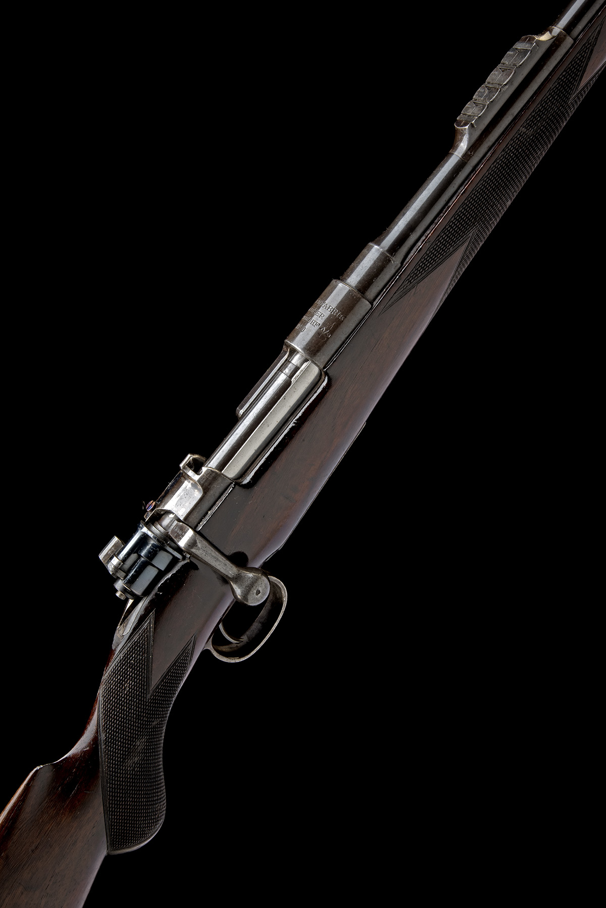circa 1901, 25 1/8in. nitro barrel engraved 'JOHN RIGBY & CO. 72. ST. JAMES'S ST. LONDON', block-mounted folding leaf sights with white metal-inlaid sight lines and marked for 100, 200, 300 and 400 yards, ramp-mounted fore-sight, barrel, receiver and bolt with Mauser serial number 2867, receiver (with thumb cutout) engraved 'WAFFENFABRIK MAUSER OBERNDORF A/N 1900', detachable floorplate with military style release, the triggerguard stamped with Rigby no. 1913, 14 5/8in. semi-pistolgrip stock with sling eyes and ribbed steel buttplate, weight 7lb. 6oz.
