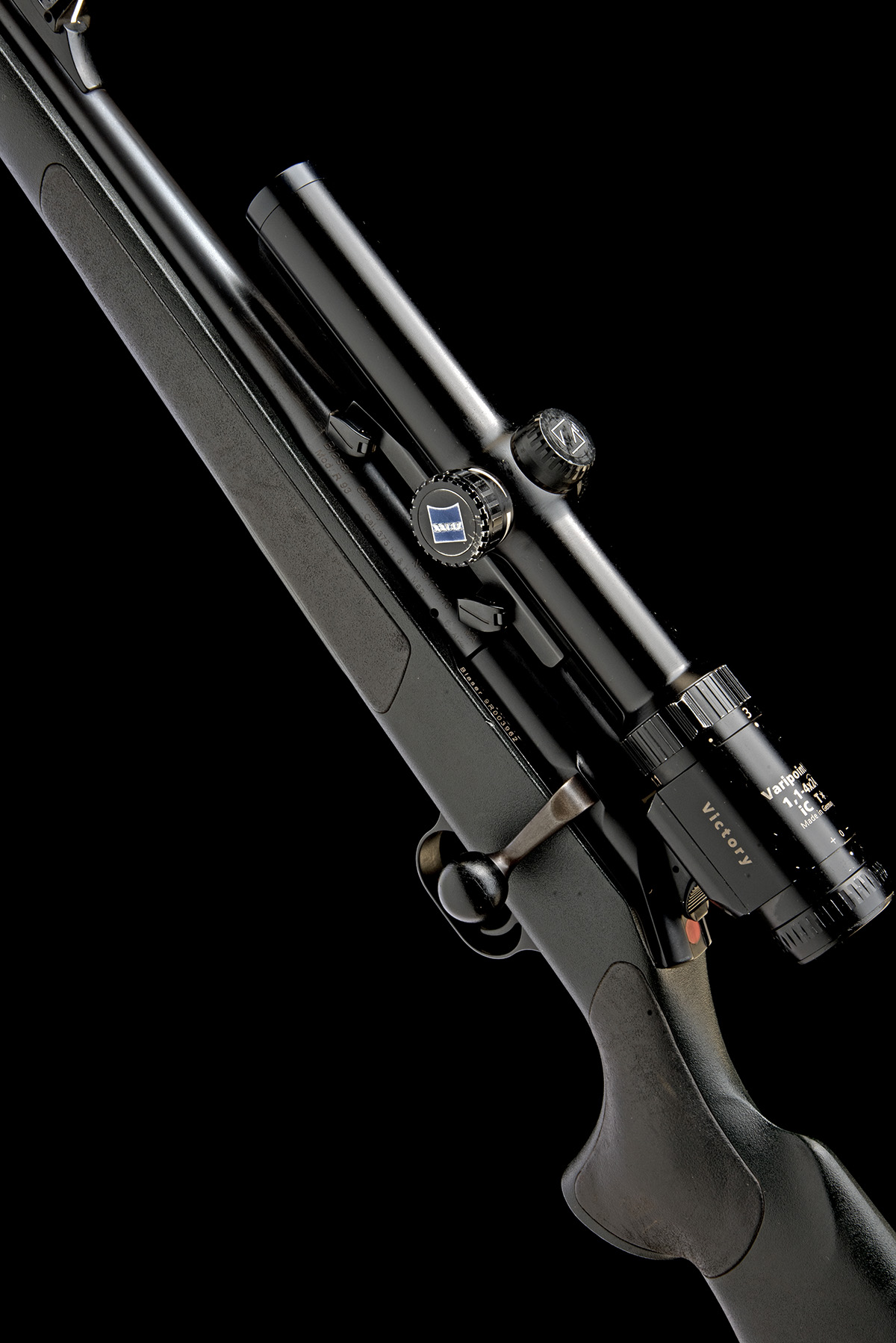 for 2008, 24 3/4in. ported nitro barrel with ramp-mounted open sights and ramp-mounted bead fore-sight, the breech end fitted with a Zeiss Varipoint M 1,1-4x24 iC T* Victory telescopic sight, serial no. 3333462, on a Blaser quickly-detachable rail mount, dark green synthetic stock with black rubber grip panels, left hand palm swell, sling eyes, 14 3/8in. pull including 1/2in. rubber recoil pad, weight 7lb. 10oz. (unscoped) and 9lb. 2oz. (with scope), in its makers take-down abs case
