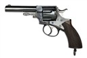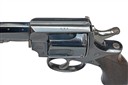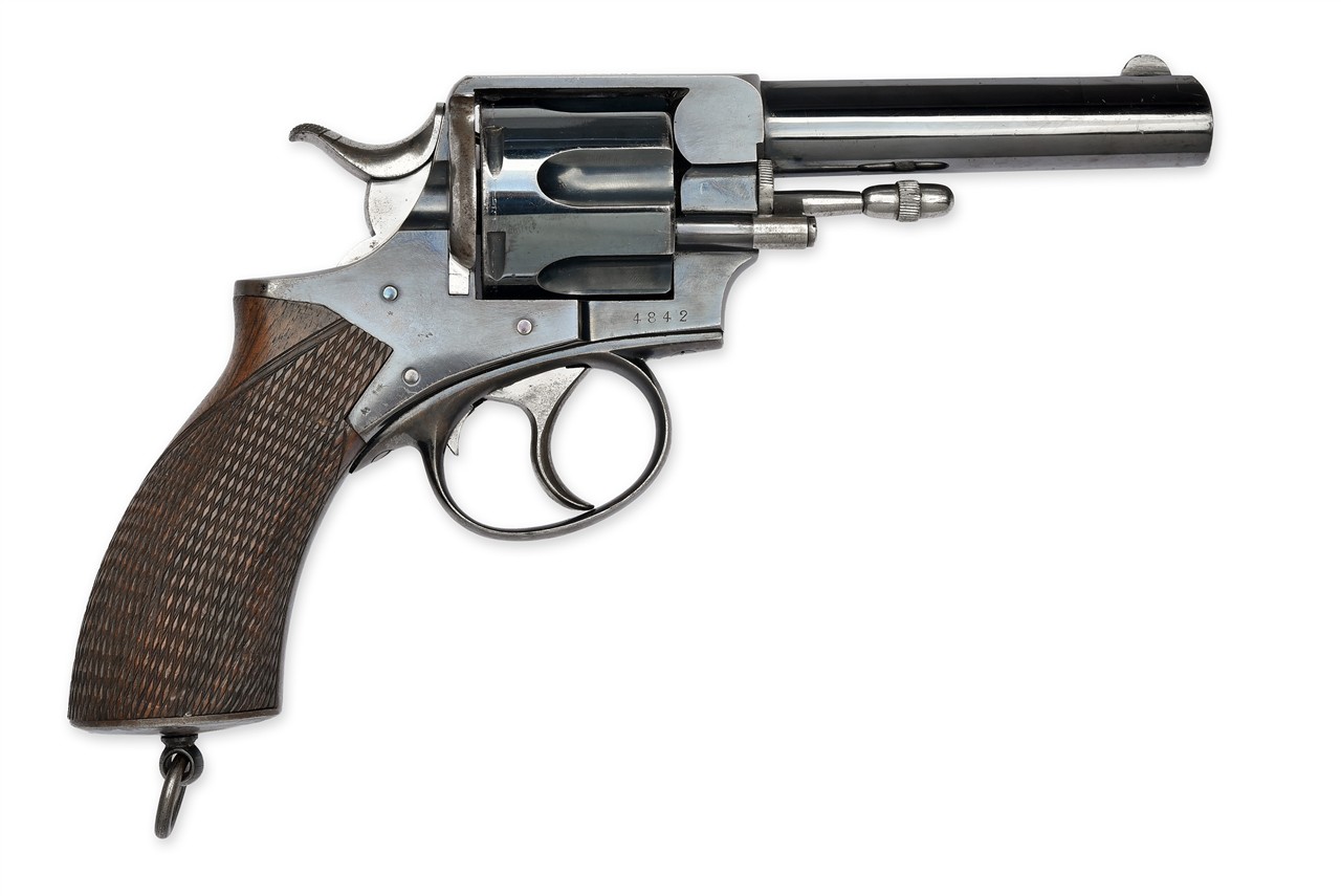 circa 1888, with blued ovoid 4 1/2in. barrel, crescent fore-sight, sighting groove to the top-strap, the sides marked 'ARMY & NAVY' and 'C.S.L.', blued solid frame marked on the barrel mount in an ellipse 'WEBLEYS R.I.C. No.1 .455' above 'NEW MODEL', blued six-shot fluted cylinder, gate loading, ejector rod with acorn finial, double action mechanism with guarded trigger and spurred hammer, chequered walnut grip, lanyard swivel at heel, the whole retaining much original finish