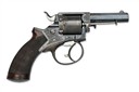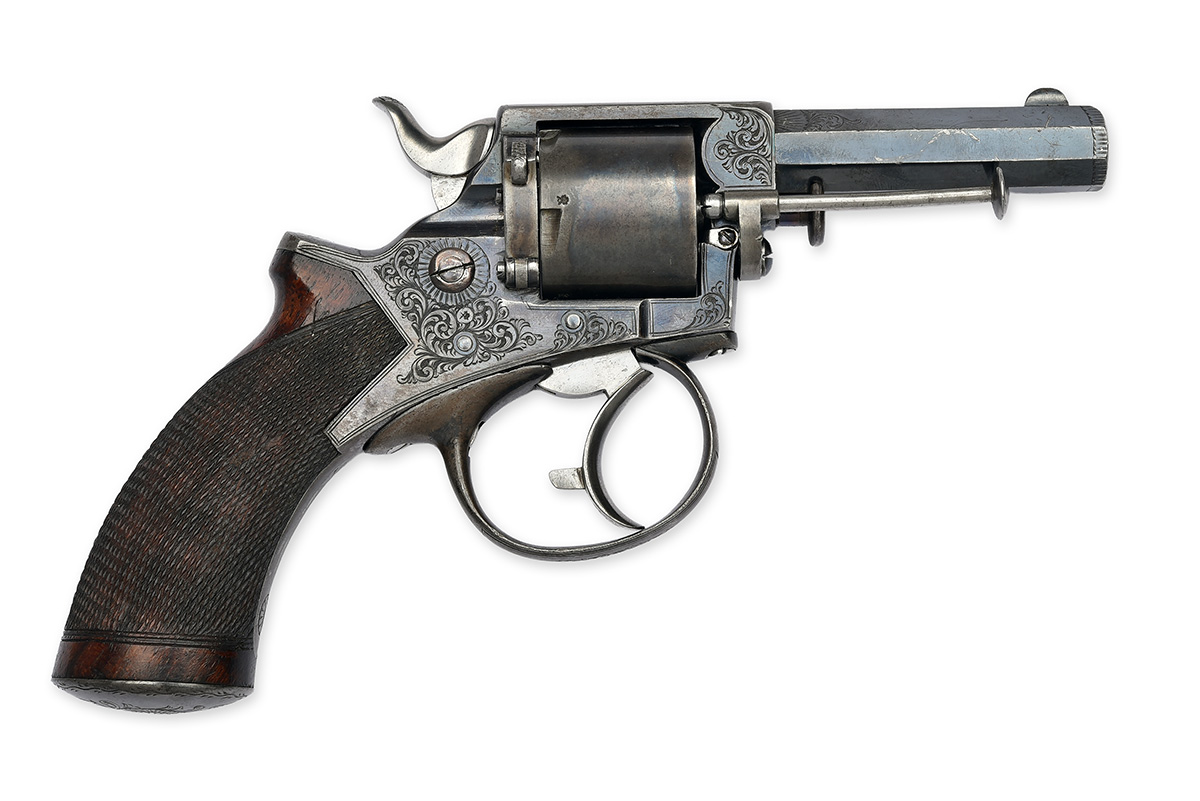 circa 1870, with blued octagonal 3in. barrel signed on the top-flat 'JAS WOODWARD, ST JAMES ST. LONDON', crescent fore-sight, engraved band at muzzle, scroll engraving to barrel throat, borderline and scroll engraved solid frame with sighting groove to the top-strap, colour hardened plain five-shot cylinder with recessed chambers and friction device to arbor at front, double-action mechanism, chequered walnut grip, guarded trigger and ejector rod stored alongside the frame below the cylinder on the right hand side, much faded colour and blued finish remaining