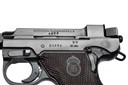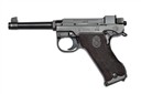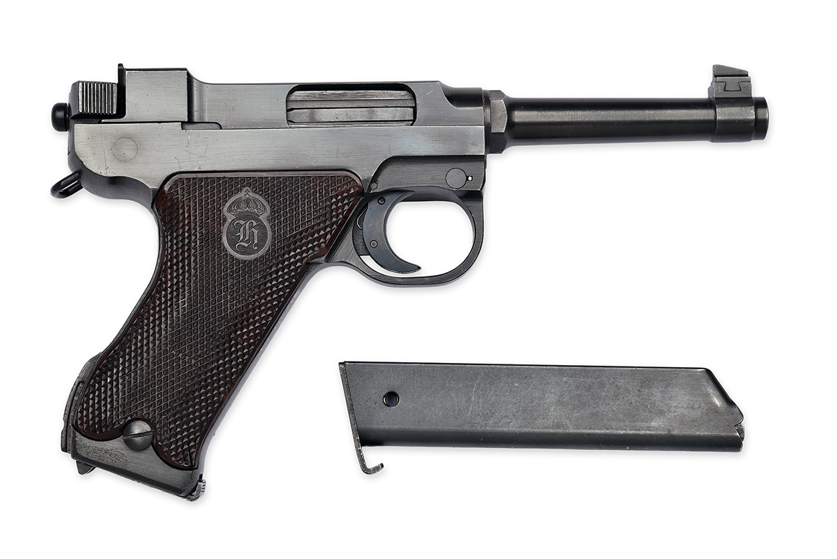 for 1945, a Swedish made version of the M35 Lahti, with blued 4 3/4in. barrel, squared receiver with internal bolt, cocking piece to rear, blued frame and red-brown chequered bakelite grips, virtually all finish remaining, with a spare magazine