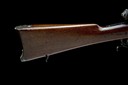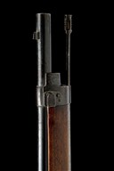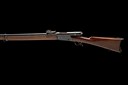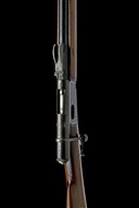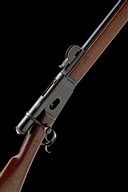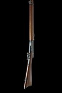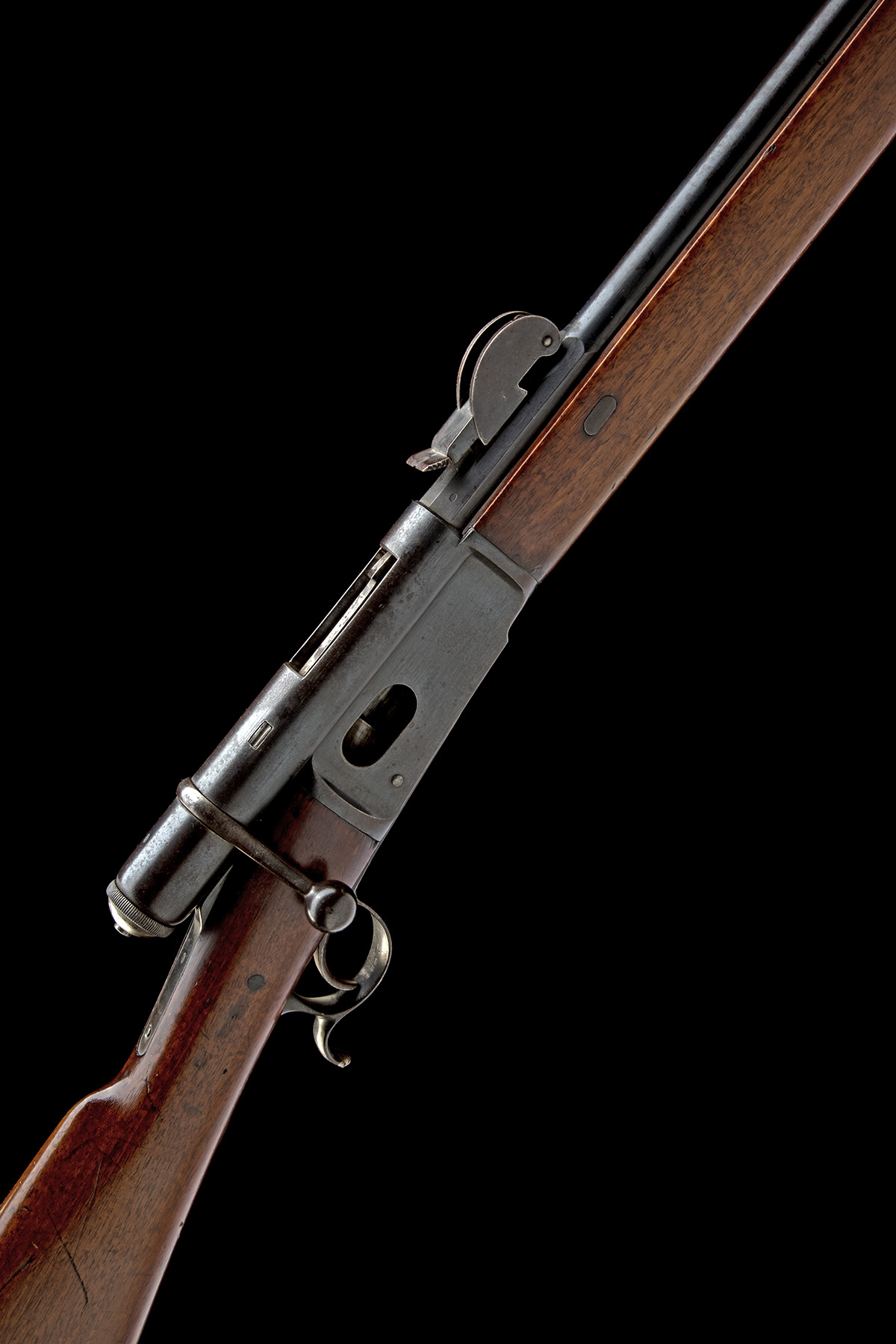 circa 1883, with blued 33 1/8in. barrel, block and blade fore-sight, elevating tangent rear-sight, rounded bolt-action receiver body with loading aperture to the right, walnut straight hand butt-stock, iron heel-plate and spurred trigger-guard, plain trigger, full-length walnut fore-end with concealed magazine tube and iron clearing rod, single iron barrel-band and moulded nose-cap, much finish throughout