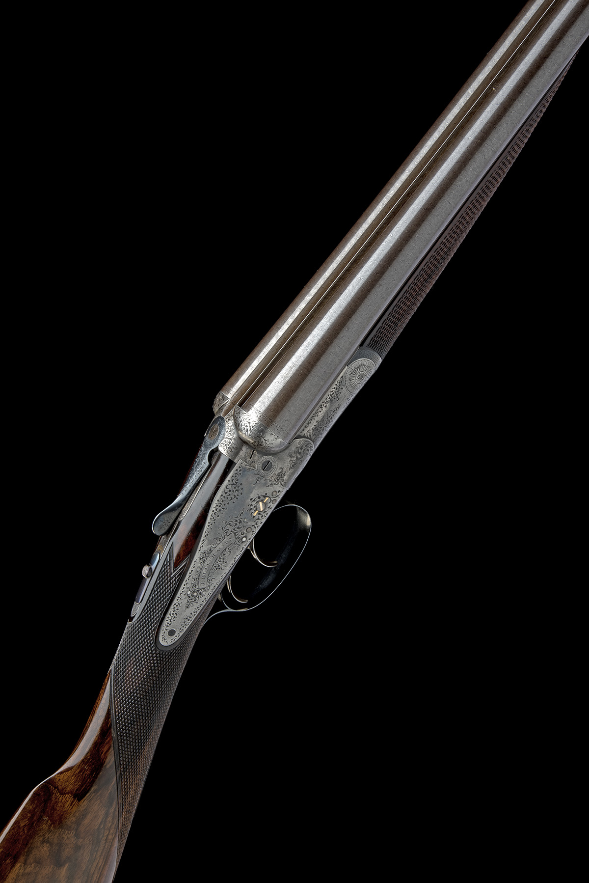 circa 1896, 27 7/8in. nitro reproved damascus barrels (in 1988), the rib engraved 'J. BLANCH & SON. 29 GRACECHURCH STREET. LONDON.', 2 1/2in. chambers, bored approx. 1/4 and 1/2 choke, treble-grip action with gas checks, automatic safety with gold-inlaid 'SAFE' detail, gold through-lined cocking-indicators, best bold acanthus scroll engraving with ornate bordering, retaining very slight traces of colour-hardening and some renewed finish, 15 1/4in. figured stock including rubber recoil pad, fore-end with 'J. BLANCH & SON'S IMPROVED SNAP BOLT.' release lever, weight 5lb. 12oz.