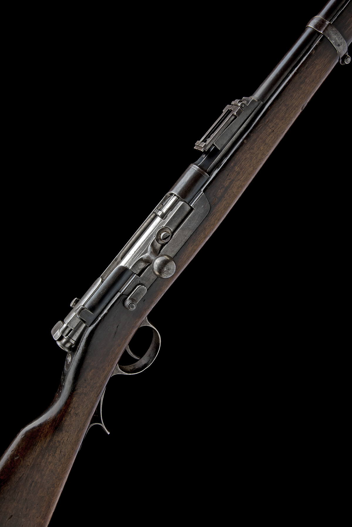 dated for 1886, with blued 32 1/2in. sighted barrel numbered '691', rounded receiver, brushed bright bolt with straight bolt handle numbered 'RR183', the action body stamped 'OE.F.G. STEYR 1886', a ribboned crown over 'L.I.' and 'M1886', walnut full-stock (bruised) with concealed full-length magazine tube and complete with cleaning rod mounted in a channel on the left hand side of fore-end, much finish remaining, miss-matched numbers, fair amount of finish