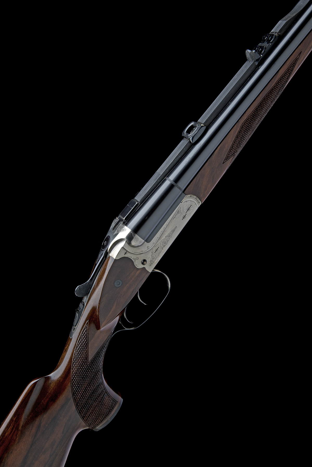 for 2008, 23 5/8in. nitro barrels, broad partially raised matt rib with open sights and folding leaf sights, the leaf sights marked '50' and '75', ramped bead fore-sight, the breech end with quickly-detachable telescopic mount bases, bolstered scroll-back treble-grip action, removable striker discs, automatic safety, side-mounted pin cocking-indicators, border and scroll engraving, bright and blued finish, 14 3/4in. pistolgrip stock with cheekpiece, sling swivels, 5/8in. recoil pad, weight 10lb. 10oz., in its original carton together with paperwork (including Gewehr-pass and a digital sighting target for 75m, using RWS 19,5 tug 500g ammunition)