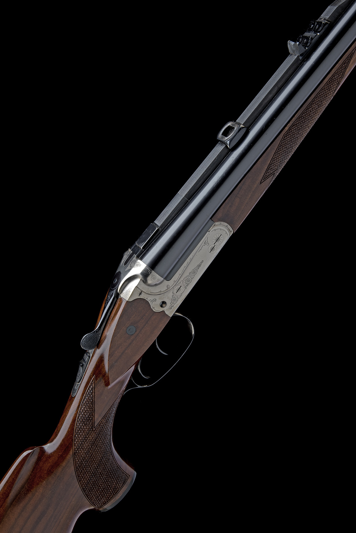 for 2008, 23 5/8in. nitro barrels, broad partially raised matt rib with open sights and folding leaf sights, the leaf sights marked '50' and '75', ramped bead fore-sight, the breech end with quickly-detachable telescopic mount bases, bolstered scroll-back treble-grip action, removable striker discs, automatic safety, side-mounted pin cocking-indicators, border and scroll engraving, bright and blued finish, 14 5/8in. pistolgrip stock with cheekpiece, sling swivels, 3/4in. recoil pad, weight 11lb. 1oz., in its original carton together with paperwork (including Gewehr-pass and a digital sighting target for 75m, using Federal 500g bonded solid ammunition)