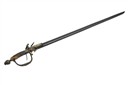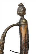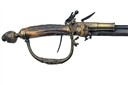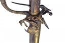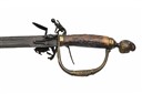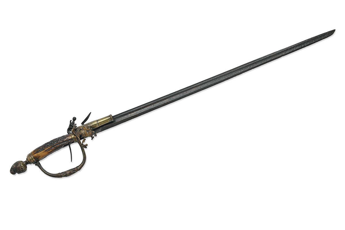 English, circa 1770, with straight single-edged 25in. blade with broad central fuller and a narrow fuller along the back, both extending to near the reprofiled tip (stained and pitted), the forte of blade fitted with a brass 2in. turn-off cannon barrel (frozen), London proved breech, the reverse side of blade fitted with the pan, frizzen and exposed frizzen-spring, brass pierced turned-down cross-guard (incomplete), natural stag hilt with long exposed trigger blade within the 'D' shaped knuckle-bow and cast brass 'knights-head' pommel